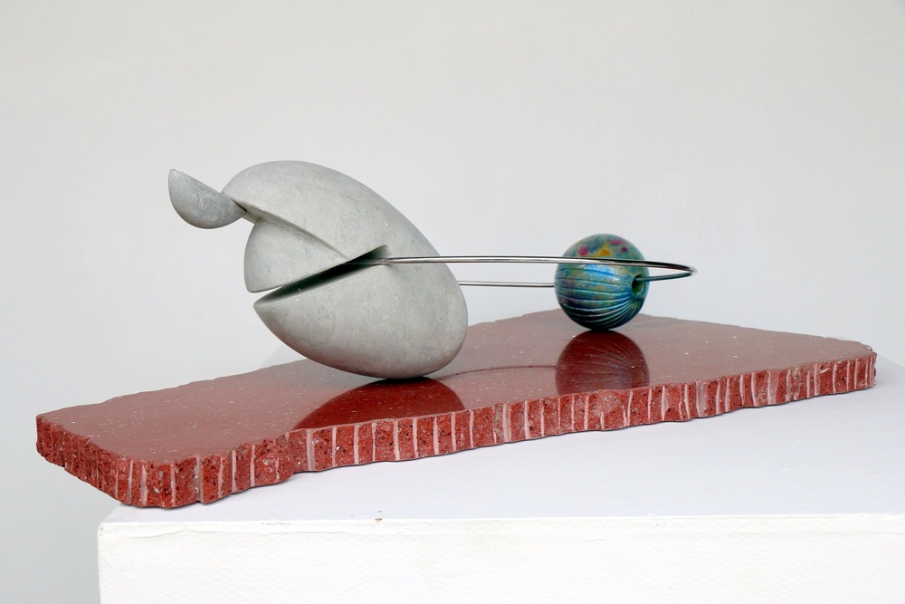 Mais les paradoxes ne s’arrêtent pas là. Didier Poisson arrive à condenser dans une même œuvre le vertige de l’espace infini et la suggestion de l’intimité: son audacieux « Traceur du temps » évoque, sur fond de pierre rouge lunaire, le mouvement cosmique des planètes, mais aussi la beauté privée d’un collier prêt à être offert dans son bel écrin irrégulier... L’éphémère et l’intemporel fusionnent dans un même objet.